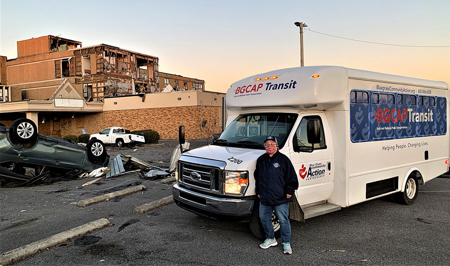 Sunday evening, three vehicles and three drivers from Bluegrass Community Action Partnership, Inc. arrived in Fulton to go to work in the Mayfield area Monday morning. Throughout the week before Christmas and the next week, drivers from Federated Transportation Service of the Bluegrass, Rural Transit Enterprises Coordinated, Inc., Frankfort Transit System, and Transit Authority of River City also arrived ready to do what they do best – moving people from place to place.